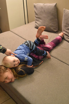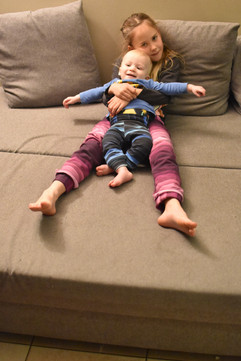 Het rokje maakte ik uit de gele Nicky velours in een eenvoudige uitvoering zonder zakken. Voor de Nina broek gebruikte ik de french terry strepen stof in de groentinten passend bij de ananassen en de gele Nicky velours. Wat ik superleuk vond, was het spelen met de strepen en dus voor de zijstrook de stof 90° draaide om een tof effect te verkrijgen. Natacha maakte dezelfde broek voor Lukaz en zo konden mijn twee schatten even twinnen en samen poseren. Leuk, maar niet simpel, zeker niet als de foto's binnen in huis gemaakt worden...