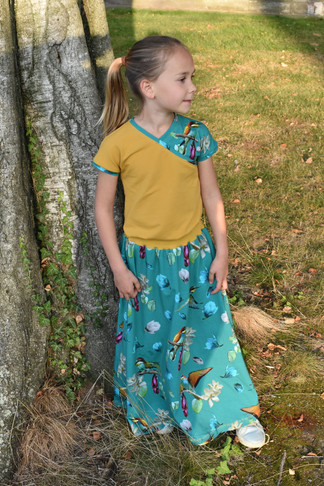 Er waren enkele aanpassingen, maar geen hele zware, dus ik ging alvast aan de slag met een leuke katoentricot stof. Het gaat om de turquoise kleurige stof van Bienvenido Colorido met ijsvogeltjes op, die nog te koop is via de webshop. Deze combineerde ik met een okergele boordstof, eveneens nog beschikbaar om aan te kopen. Ik maakte een lengte korter en waauw, was helemaal blij met het resultaat dat ik bekomen had.